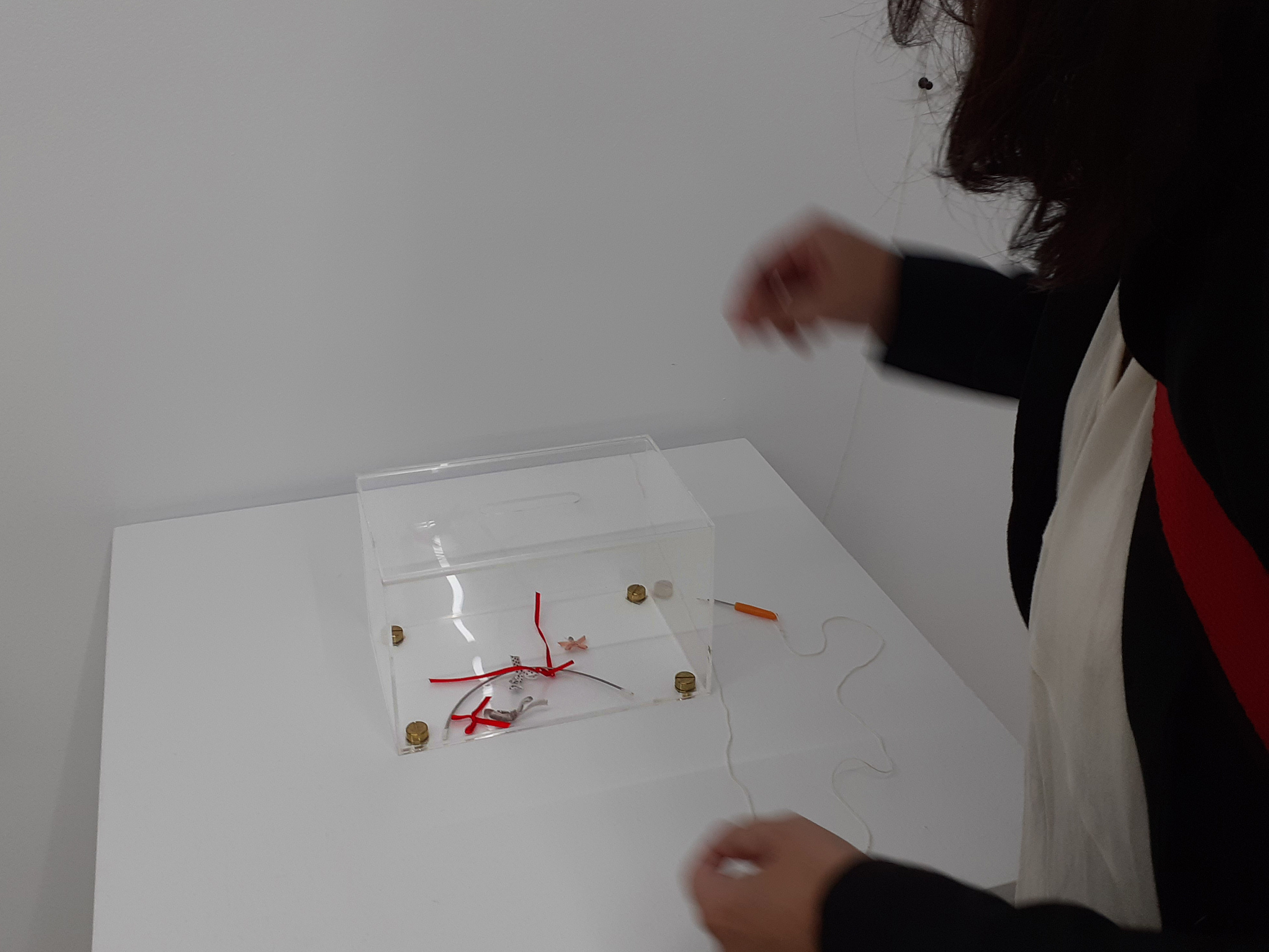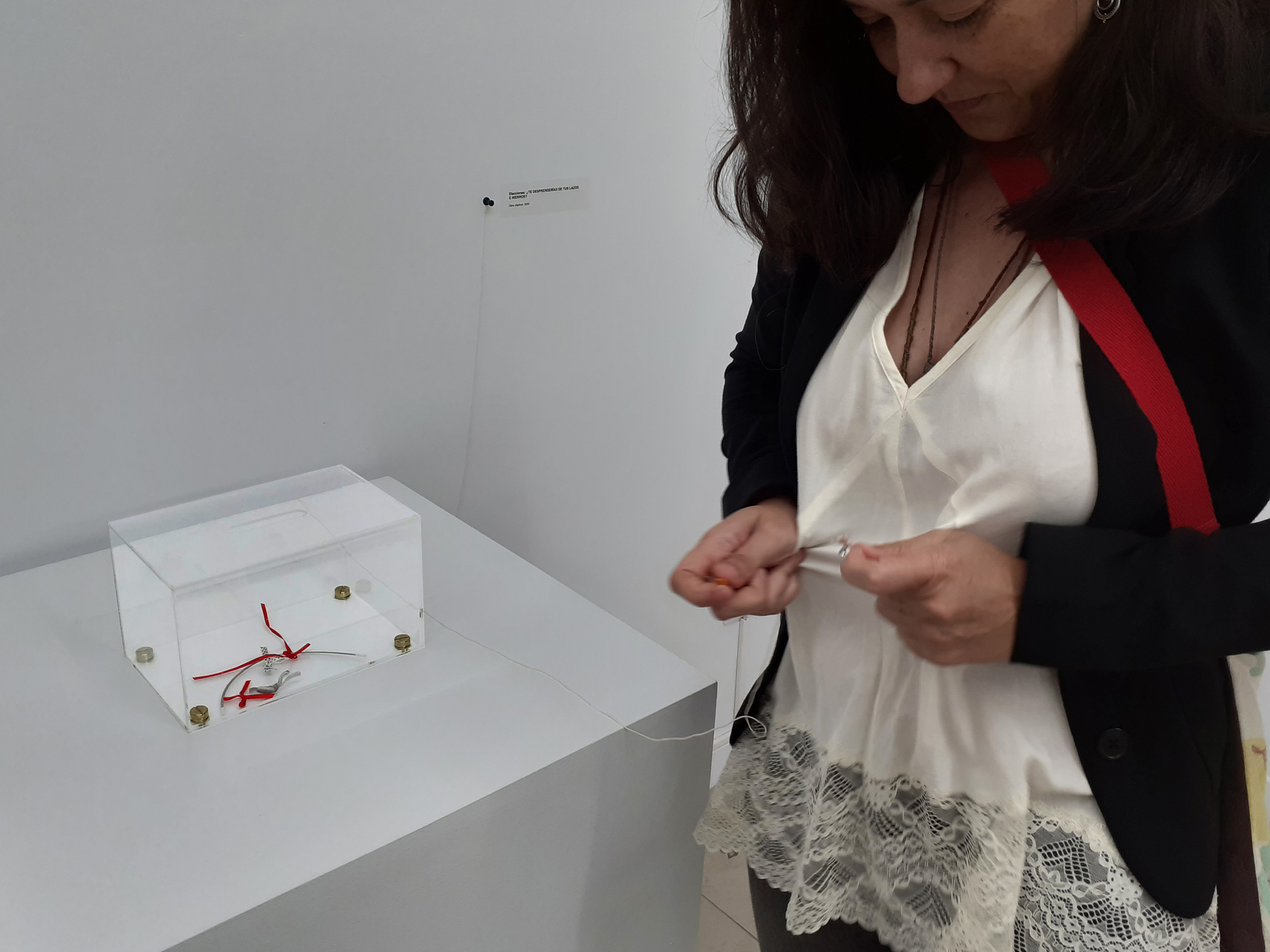 ELECCIONES: ¿TE DESPRENDERÍAS DE TUS LAZOS Y METALES?. Obra objetual con interactuación del público. 2022.Urna (23x15x14cm.) y descosedor de costuras.